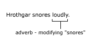 Example 4 – “Hrothgar” is a noun functioning as the subject of “snores.” “snores” is a verb functioning as the core of the predicate. “loudly” is an adverb modifying “snores.”